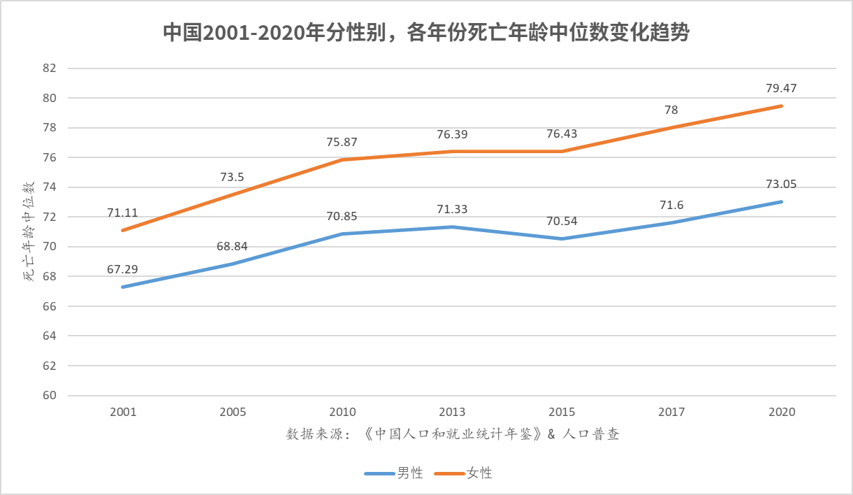 同时,无论是女性还是男性死亡年龄中位数是正在后移的,就比如女性在2001年的时候死亡年龄中位数是71.11岁,到了2020年就接近80岁(79.47岁)。男性同理,只是增长速度比女性稍慢